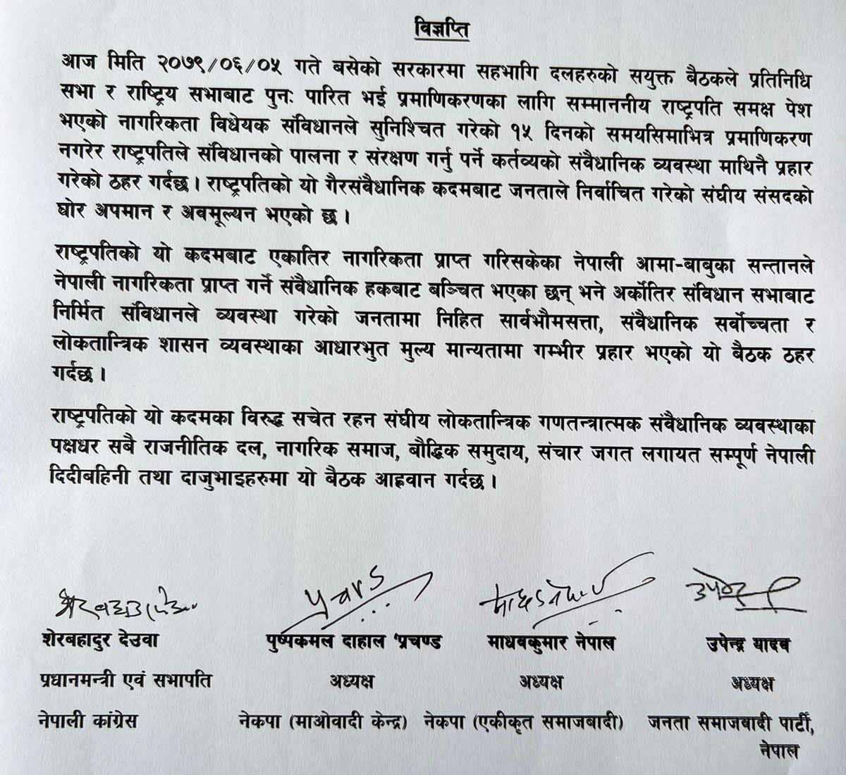 असोज ८ गृहमन्त्री बालकृष्ण खाँणले नेपालको राष्ट्रियता बलियो पार्न नागरिकता विधेयक ल्याइएको दावी गरेका छन् । उनले नागरिकता विधेयकको बारेमा गलत विश्लेषण नगर्न आग्रह गरे..