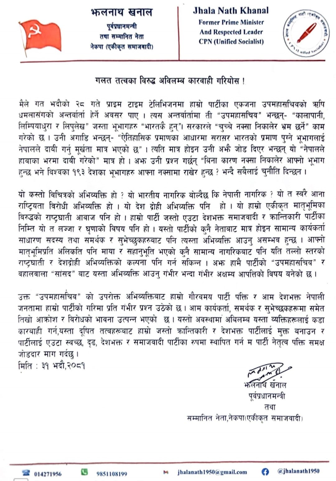 नेकपा एसका नेता झलनाथ खनालले पार्टीका उपमहासचिव एवम् सांसद मेटमणि चौधरीले कालापानी, लिपुलेकका विषयमा दिएको अभिव्यक्ति घोर राष्ट्रियता विरोधी भएको भन्दै कारबाहीको माग गरेका छन् ।